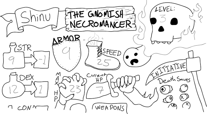 If you go for the slightly more luxurious packages I'll also make a character sheet that reflects a bit of your character's personality or I'll draw a cartoony picture of your character (or both). Don't expect an amazing realistic portrait or anything. My drawings are rather basic, but I like to think they have a certain charm.